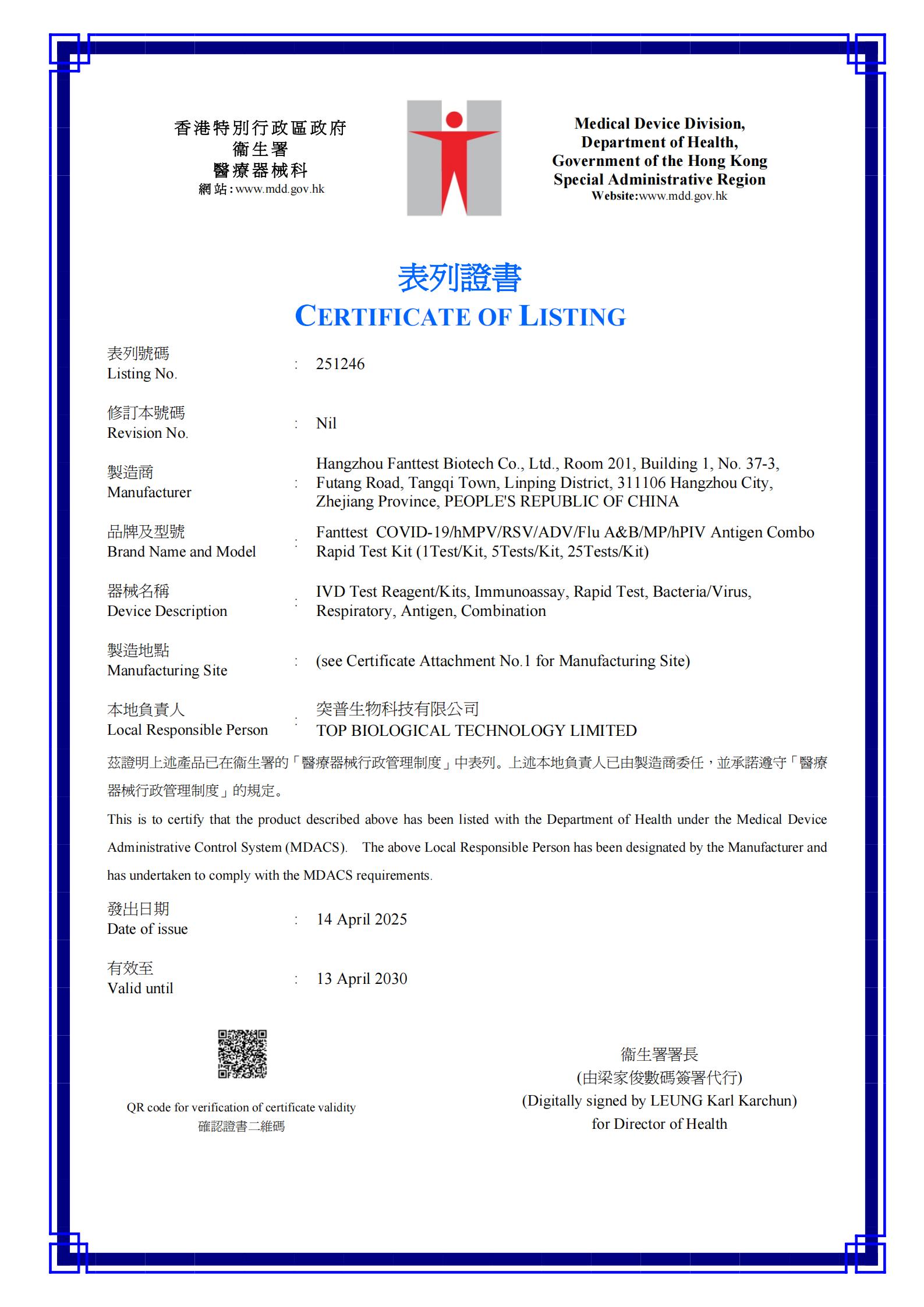 fanttest brand 8-in-1 Respiratory Antigen Test Kit has obtained the listing certificate from the Department of Health of the Hong Kong SAR (HKMD), and the listed number on the certificate is 251246 and the CE mark in European Union (EU).